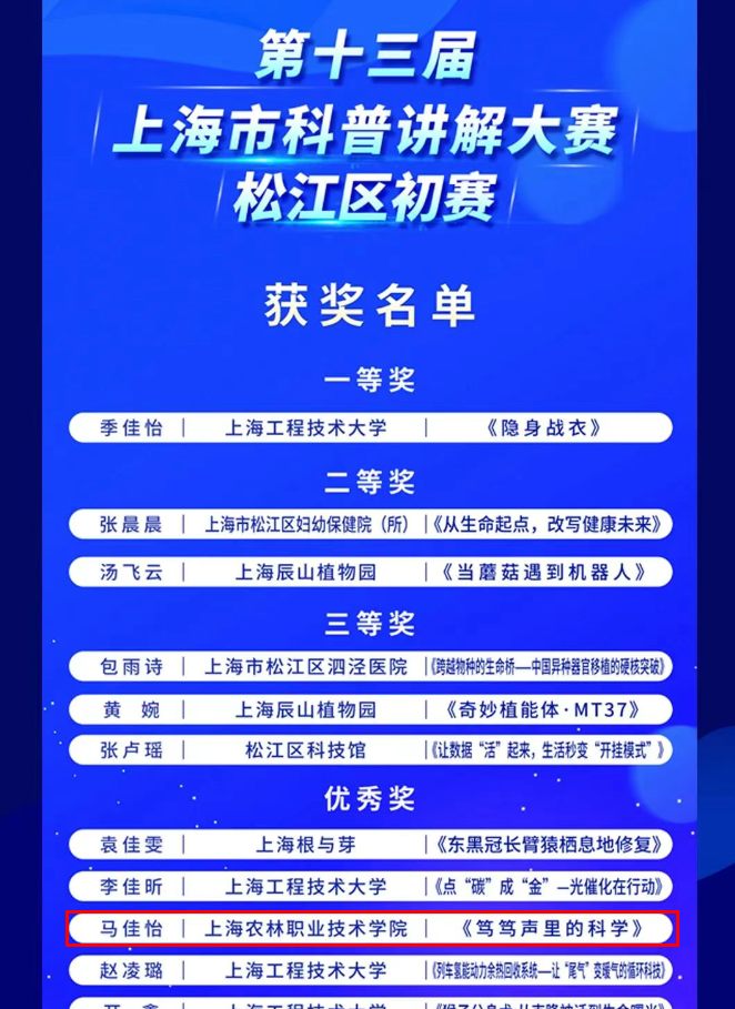 为深入学习贯彻习近平总书记系列重要讲话精神,切实落实“把科学普及放在与科技创新同等重要的位置”的要求,普及科学知识、弘扬科学精神,为上海建设具有全球影响力的科技创新中心注入活力,1月15日,第十三届上海市科普讲解大赛松江区初赛正式举办。我校马佳怡同学凭借作品《笃笃声里的科学》,以生动鲜活的讲解、扎实的科学素养在众多选手中脱颖而出,荣获优秀奖,充分展现了我校学子在科普传播领域的亮眼风采。